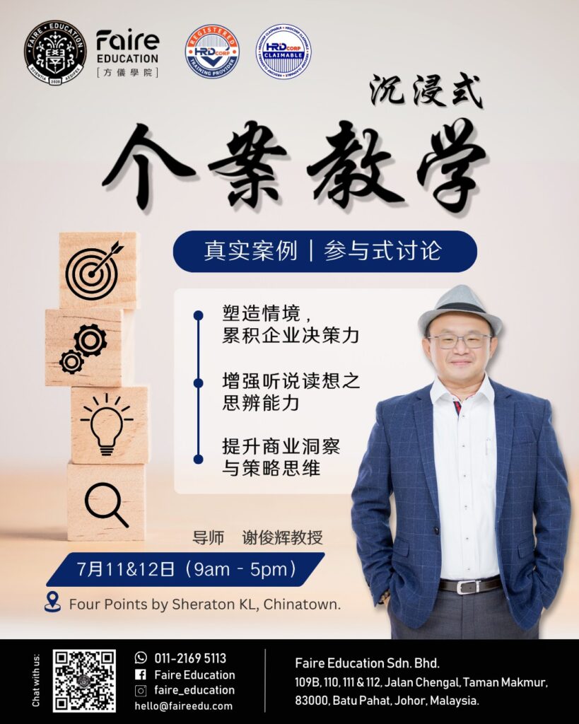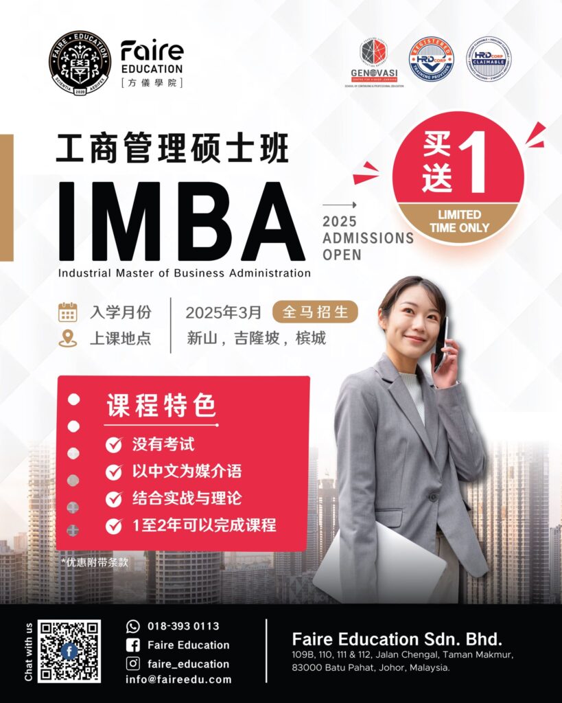 打造未来领袖 培养下一代企业掌托人 卓越的领导训练系统化的管理思维马来西亚高阶企业课程 点击了解更多 使命 融合学术知识与实战能力,开启学生潜在力成为终生竞争优势,让每一位学生站在世界的顶端,被世界看见。 愿景 成为马来西亚最顶尖的教育机构,成就最优秀的学子,让追求卓越成为生活的一部分。 核心价值观 运用智慧的碰撞,抵达梦想的所在。 使命 融合学术知识与实战能力,开启学生潜在力成为终生竞争优势,让每一位学生站在世界的顶端,被世界看见。 愿景 成为马来西亚最顶尖的教育机构,成就最优秀的学子,让追求卓越成为生活的一部分。 核心价值观 运用智慧的碰撞,抵达梦想的所在。 Faire Education品牌故事 方儀教育集团结合实战操作能力与稳固知识基础核心的理念成就每一位学员,学员们在这类型的教育氛围,培养独立的竞争能力,以最贴近社会需求竞争力的优势,知识转换智慧的力量成就专属自己的人生,同时改变家庭的命运。2020 成立于马来西亚南部峇株巴辖的方儀教育集团,致力成为引领马来西亚高等教育迈向世界之门的教育集团,并且与多家马来西亚知名企业合作,共同设计每一门学科学员的就业蓝图,让学以致用成为未来学员最自豪的一面,也让一技之长真正的帮助到每一位用心学习的学员。教育为公,以达天下为公。 我们的课程 我们专注成人教育,赋能企业成长。我们为企业与职场人士提供实战课程,助你打造系统化管理与执行能力。 IMBA 工商管理硕士班 点击了解更多 IDBA 工商管理博士班 点击了解更多 TTT 讲师认证培训班 点击了解更多 让我们迈向行业第一 创造更美好的未来 校友 0 企业家 0 国家 0 校友企业 学生上课后的心得 这堂课让我获益良多,老师一针见血的指出我之前在做文案和内容上的痛点。在上这堂课之前我总是会把问题复杂化,上了这堂课之后,我会更加注重在深入了解和分析消费者的生活轨迹,以便我能够更好的将产品介绍给我的客户。 这堂课让我收获满满,我发觉我们需要更加得了解环境,客户的心灵和想法还有我们的目标。当我们更加了解这些东西了过后,会让我们更加准确地抓住客户的心理。